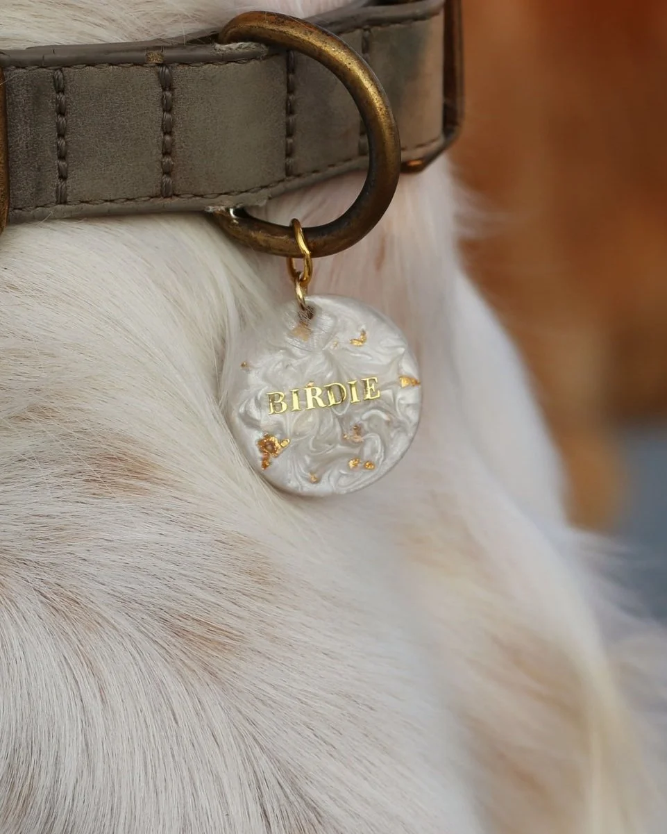 Soft and luminous, this tag captures the quiet glow of moonligh. A smooth white pearlescent base is accented with delicate gold leaf and finished in gold writing. Timeless and serene, like a shell found in the sand under a full moon.